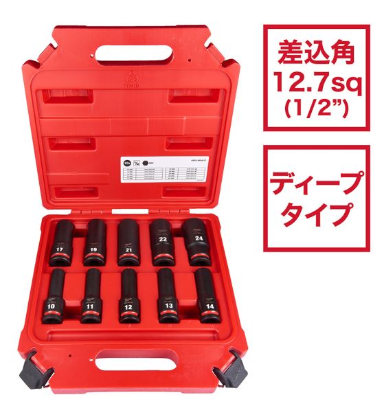 - 内容:1/2インチ(12.7mm)角 10mm, 11mm, 12mm, 13mm, 14mm, 17mm, 19mm, 21mm, 22mm, 24mm ディープインパクトソケット、専用収納ケース